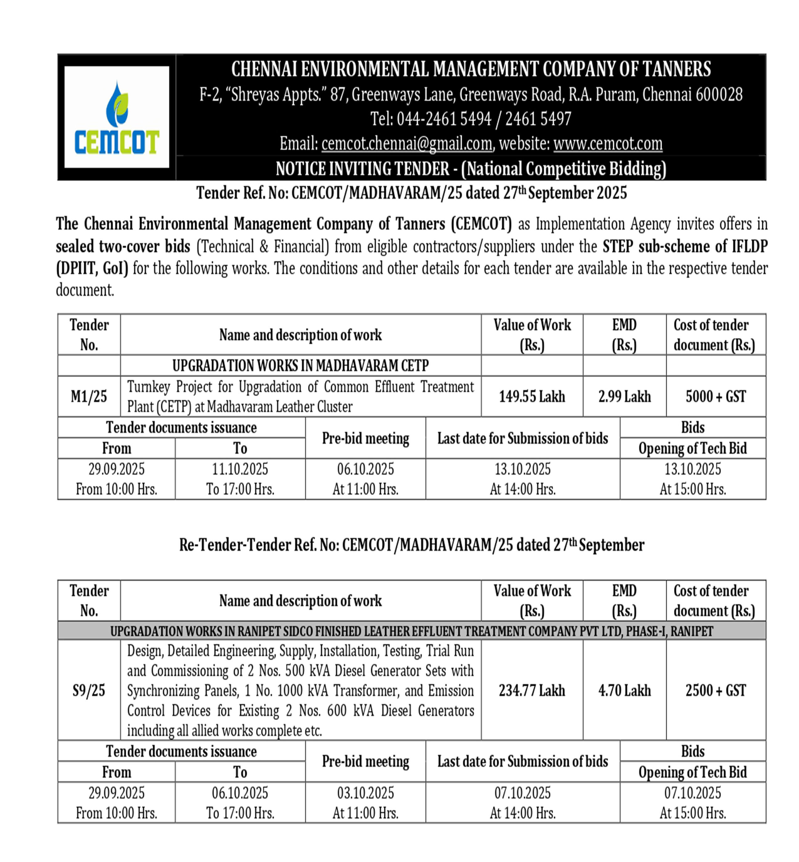 "The Chennai Environmental Management Company of Tanners (CEMCOT) as Implementation Agency invites offers from contractors / suppliers for works (other details and Pre-qualification criteria is given in Tenders tab) under the Sustainable Technology and Environmental Promotion (STEP) sub scheme of IFLDP, Department for Promotion of Industry and Internal Trade (DPIIT), Government of India. The conditions and other details are available in the tender document. CEMCOT invites sealed bids in two cover system (Cover-1: Technical Bid and Cover-2: Financial Bid) from eligible contractors / suppliers."